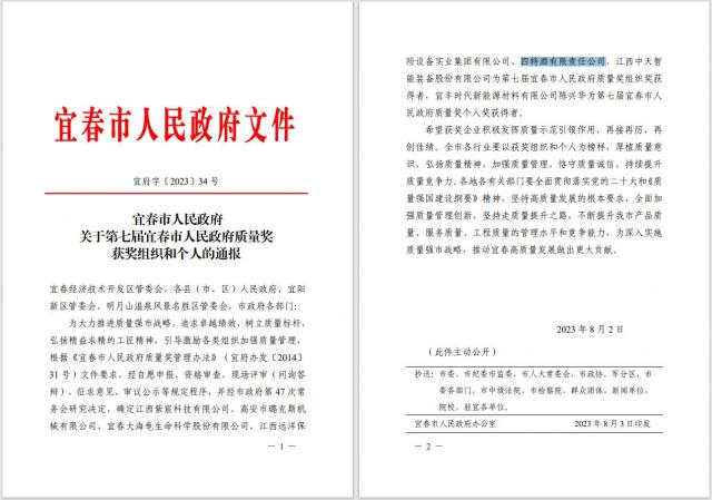 喜报!四特酒获第七届宜春市人民政府质量奖