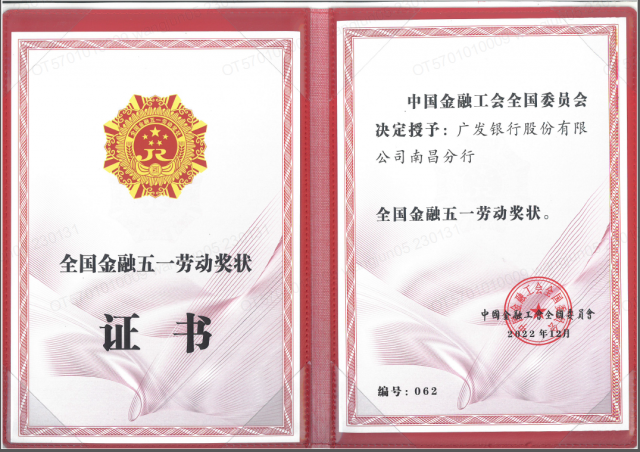 广发银行南昌分行荣获2022年度全国金融五一劳动奖状