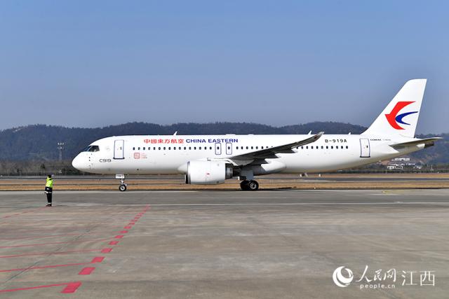1月28日,中国东航全球首架C919国产大飞机从上海虹桥起飞1个多小时后平稳降临南昌昌北国际机场。人民网时雨摄