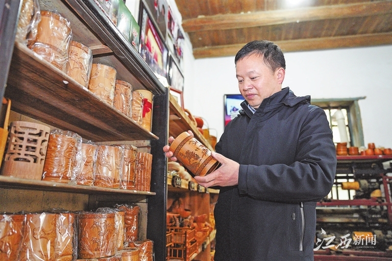 ▲2月19日,全国人大代表、井冈山市茅坪镇神山村党支部副书记左香云正在检查制作完成的竹雕工艺品。