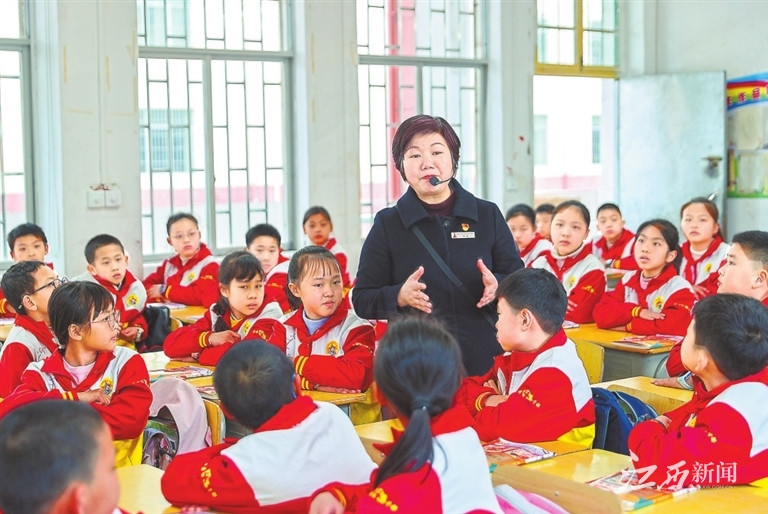 ▲2月24日,全国人大代表、于都中央红军长征出发纪念馆讲解员钟敏在长征源红军小学给孩子们讲解红色故事。摄影|江西日报全媒体记者洪子波