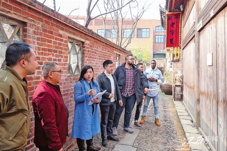 ▲2月19日,全国人大代表、景德镇陶瓷大学国际学院院长张婧婧(左三)在景德镇市陶阳里御窑景区调研。摄影|江西日报全媒体记者洪子波