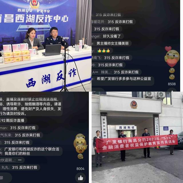 为进一步推进银行业金融知识普及工作,着力提升社会公众的金融素质和安全意识,维护广大金融消费者的合法权益,广发银行南昌东湖支行联合南昌市公安局西湖分局反诈中心于3月15日晚开展了2023年《3·15联合直播》。