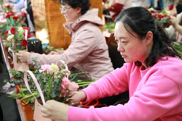娇艳欲滴的玫瑰、小巧生动的康乃馨、沁人心脾的牡丹,形态各异、姹紫嫣红的花卉摆满活动现场,专业的花艺老师用通俗易懂的语言讲解插花的基本技巧、花卉的选择、颜色的搭配、花枝长短的修剪,以及如何错落有致地将花卉插满花泥,并现场展示了经典的插画造型。