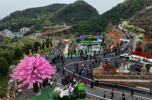 3月27日上午,广丰区大南镇古村村新塘彩旗招展、欢歌劲舞、游人如织——这是盛大举行的广丰区首届大地艺术节暨中华木绣球广丰博览园文化旅游推介会。