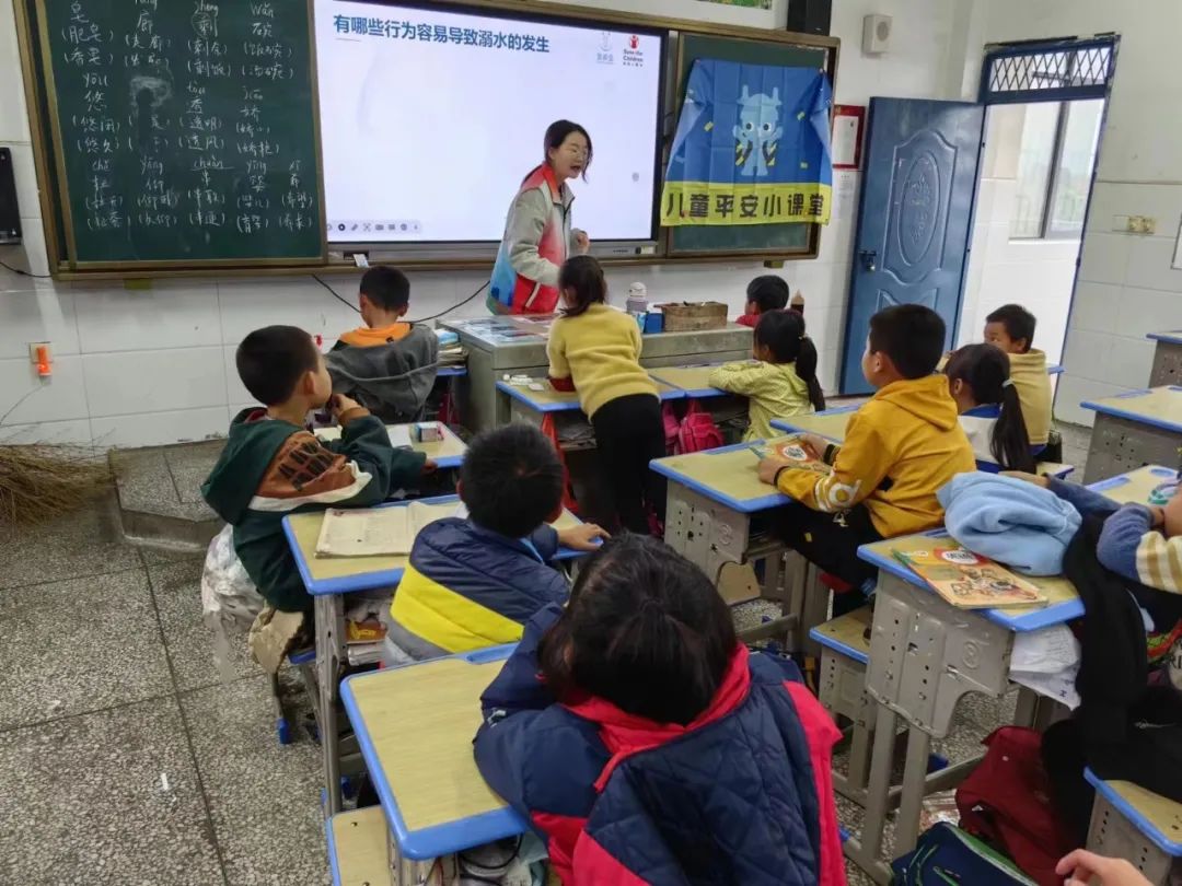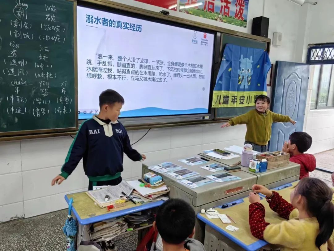 课堂中,南安乡社工站社工、壹基金安全认证防溺水讲师盛云霈以溺水事件引出话题,通过防溺水知识宣讲、观看防溺水教学视频等形式,生动讲解了有哪些行为容易导致溺水的发生、哪些地方容易有发生溺水的危险、溺水后如何自救、他人落水如何施救以及防溺水的注意事项,帮助孩子们增强防溺水安全意识,提高他们的风险感知能力和溺水自救互救能力。课堂上同学们积极举手发言,互动频繁,课程在轻松愉悦的氛围中有序进行。