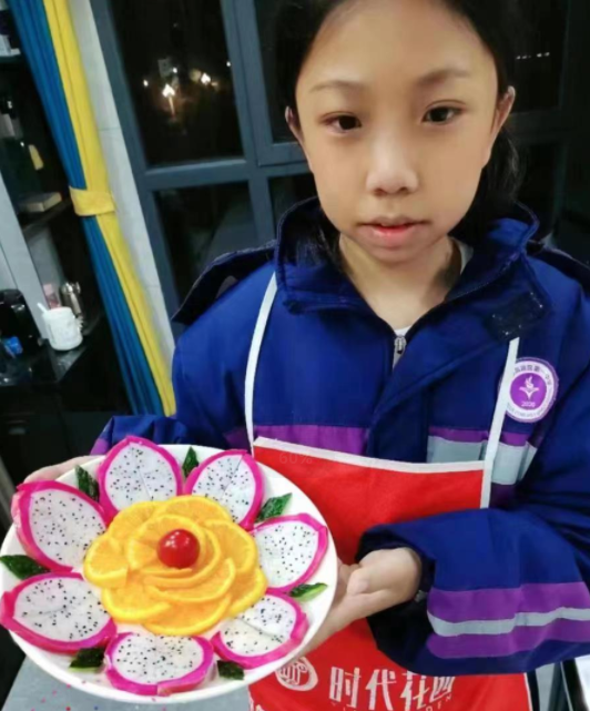 利用课余时间,同学们在家系上围裙,“八仙过海,各显神通”。清洗食材、改刀切块、点火煸炒、淋汁调味、烹炒煎煮,有模有样,同学们以拍摄照片和视频的方式报送作品,俨然是“神厨争霸”。