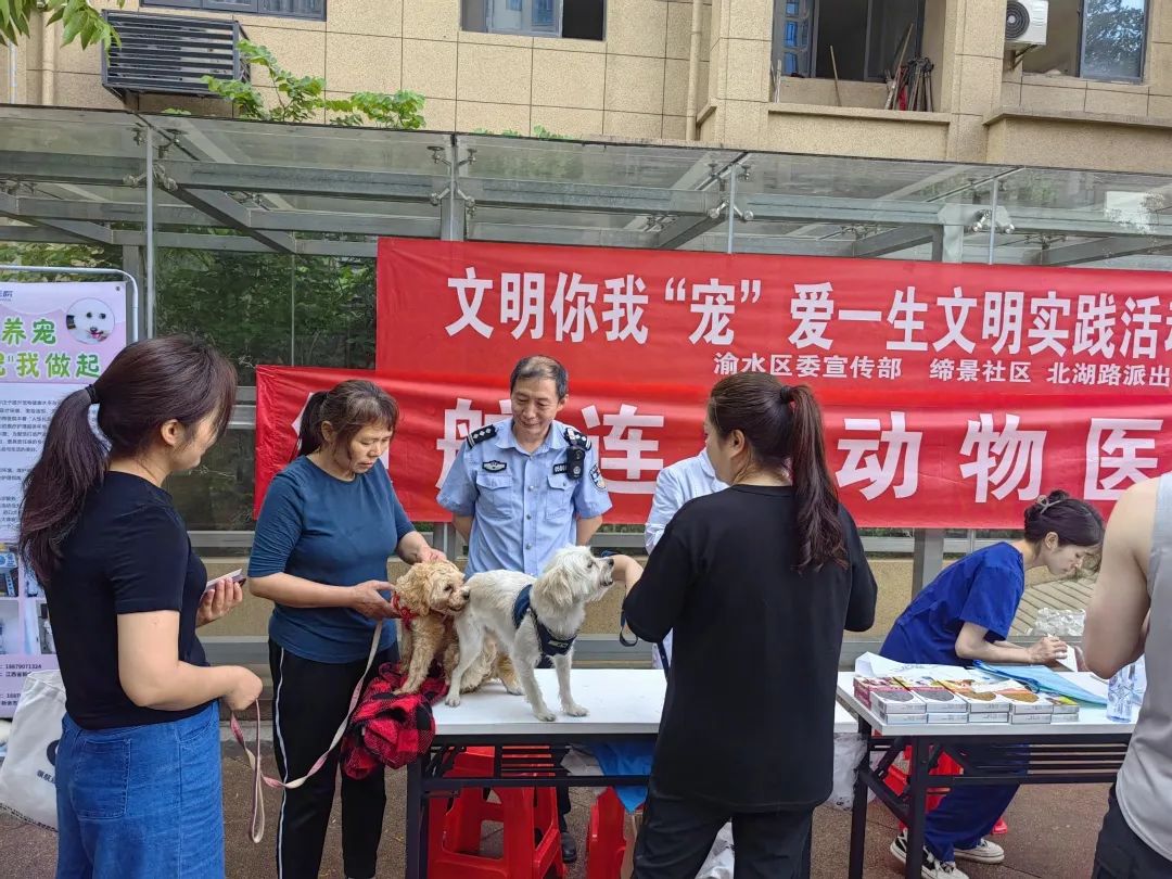 城北街道缔景社区联合渝水区委宣传部、北湖路派出所、领航连锁动物医院到北湖缔景小区开展文明你我“宠”爱一生文明实践活动,活动现场为爱犬办理犬只证、疫苗接种服务的同时,向居民发放文明养犬倡议书,提供法律咨询,答疑释惑,并赠送宠物小礼品。