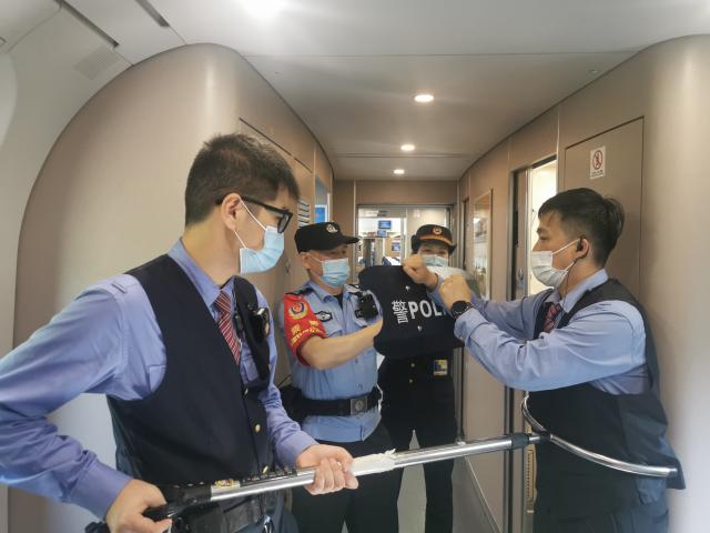 为切实提高反恐防暴处置能力,创造平安有序的列车运行环境,近日,南昌客运段联合铁路公安部门组织开展了高铁反恐应急演练。此次演练涵盖了虚拟事件现场、模拟事件上报、紧急疏散、现场处置等各个环节,反恐应急工作反应迅速,组织周密,全体参演人员配合默契,圆满完成了各项任务。(下图为2023年5月18日G1401次列车上,列车长邓小青带领车班工作人员与乘警们一道加强列车反恐演练,做好高铁列车安全预演。)