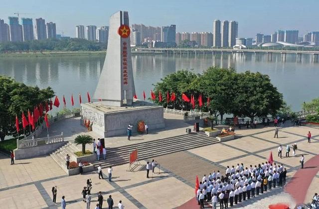 各界群众在中央红军长征出发地纪念碑前参加纪念活动。