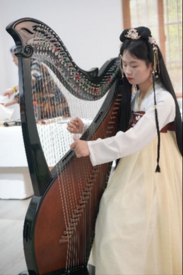 而一场即兴素描,把时间与空间都定格在了箜篌弹奏的场景中。活动主持人化身为画家,展开画纸,挥墨落笔,一幅惟妙惟俏的大美箜篌弹奏图就展现在众人眼前。