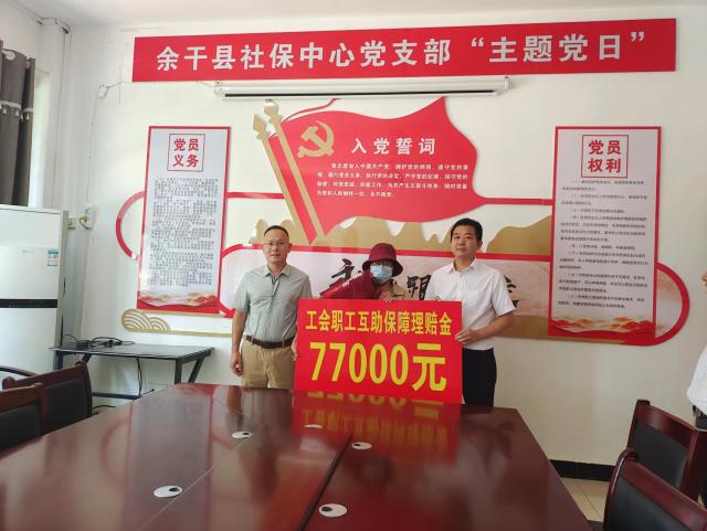 程太剑一行来到余干县社会保障服务中心,与患病职工亲切交谈,了解目前的身体状况,鼓励她保持良好心态,积极面对生活,并为她送上“大病住院自负”“特种重病”两笔职工互助保障理赔金,共计77000元。