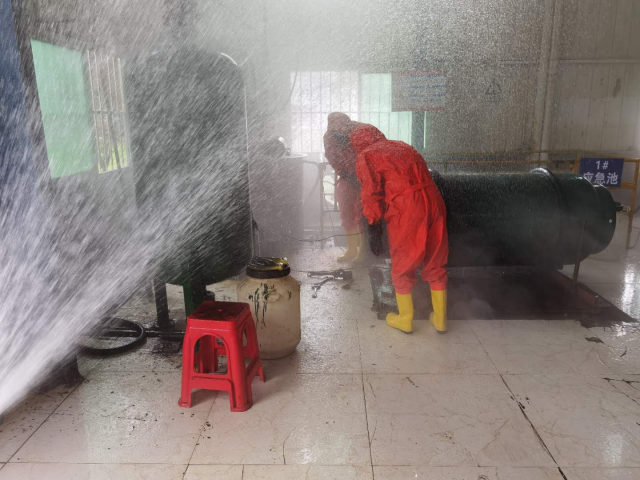 在婺源县丰润科技有限公司,县危险物品安全专业委员会组织开展氯气泄漏事故应急演练,模拟打开液氯钢瓶瓶阀时,氯气发生泄漏,公司立即启动应急预案,组织对氯气泄漏进行应急处置和中毒人员进行救援。