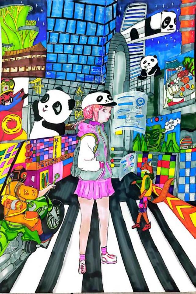 受《万神殿》《上载新生》等科幻作品启发,11岁的成都少年雷承阳通过绘画,表达了他对“数字世界”的向往。在这片“世界”中,有繁华的春熙路、驰骋在天空的熊猫列车、与人类友好交流的动物等,雷承阳说:“参与这样的活动很有意思,希望大家能为我的作品点赞。”