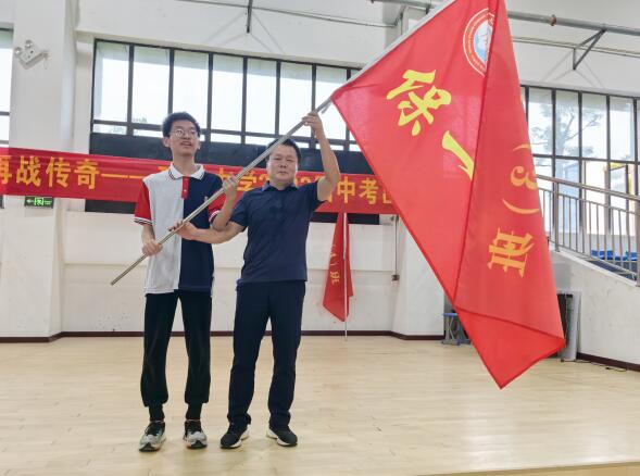 仪式最后,校长黎小勇为九年级各班班长授班旗并宣布2023年中考出征:珠珊中学九年级学子向中考进军。