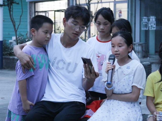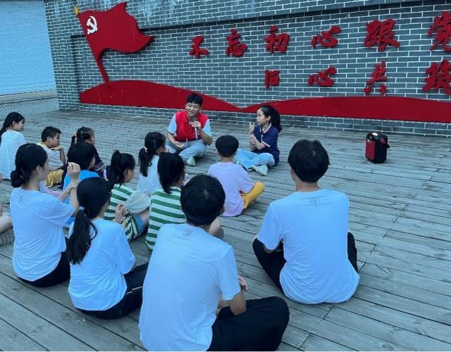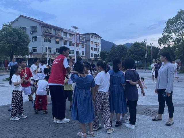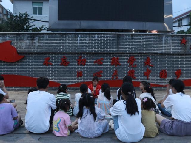 傍晚的村文化广场十分热闹,小朋友们都聚集在这里玩耍,村民们在这里聊天、跳广场舞,炎热的天气也丝毫不减队员们的宣讲热情。