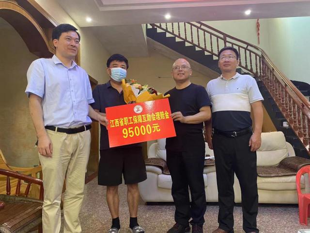 蒋云国来到理赔对象家中,为其送上9.5万理赔金,亲切与患病职工交谈,询问身体状况,鼓励他保持良好心态,积极面对。