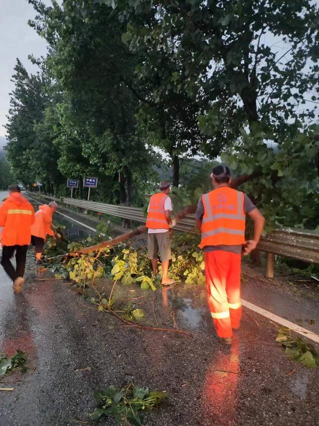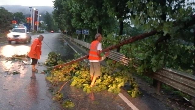 险情就是命令!弋阳公路中心及时启动应急预案,立即调集管养道班和小修队赶赴事发现场。此时,天色已晚,借着车灯的光线,养护职工冒雨着手清理路树,经过半个小时挥汗如雨的奋战,353国道又恢复了畅通,带着疲惫养护职工消失在夜幕中。