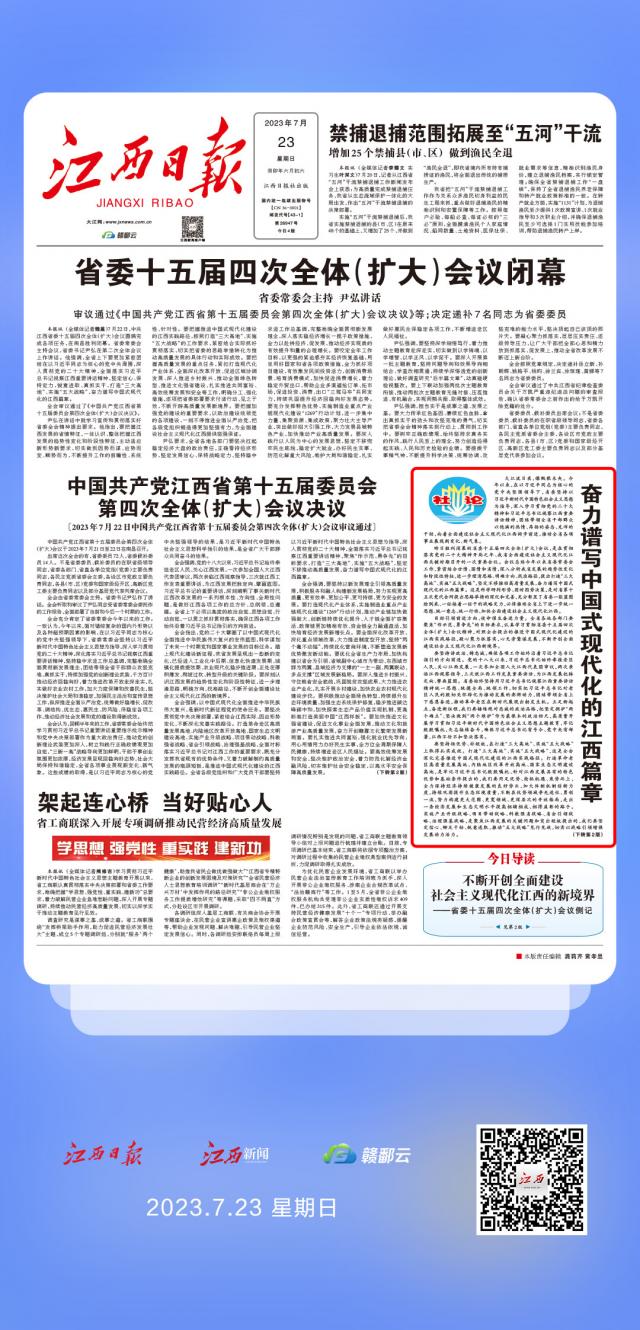 昨日胜利闭幕的省委十五届四次全体(扩大)会议,是在贯彻落实党的二十大精神开局之年、我省全面建设社会主义现代化江西关键时期召开的一次重要会议。会议总结今年以来省委常委会工作,紧密结合世情、国情和省情,深入分析我省发展的趋势性变化和阶段性特征,进一步理清思路、明确方向、找准路径,提出打造“三大高地”、实施“五大战略”,坚定不移推动高质量发展,奋力谱写中国式现代化的江西篇章。这是科学研判形势、因时因势决策,是对省第十五次党代会所提出思路举措的深化和完善,充分彰显了省委一张蓝图绘到底、一任接着一任干的战略定力,必将推动全省上下进一步统一思想、统一意志、统一行动,加快全面建设社会主义现代化江西。