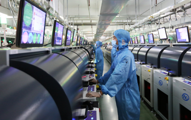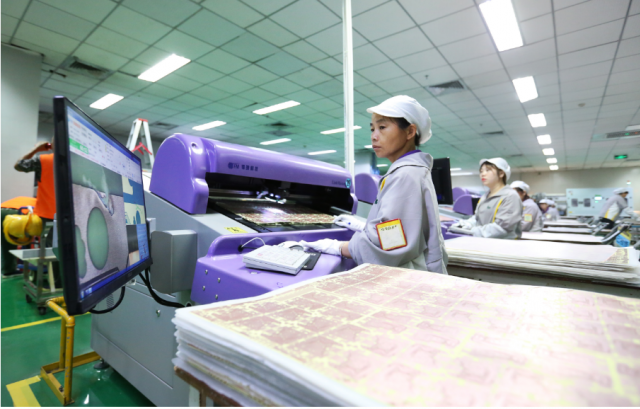 红板(江西)有限公司生产线上工人在生产高密度多层线路板。郭弘毅/摄