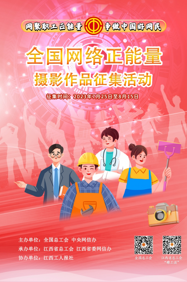 近日,由全国总工会、中央网信办主办,江西省总工会、江西省委网信办承办,江西工人报社协办的2023年“网聚职工正能量争做中国好网民”全国网络正能量摄影作品征集活动启动。活动旨在贯彻落实习近平总书记关于工人阶级和工会工作的重要论述、关于网络强国的重要思想,围绕学习宣传贯彻党的二十大精神、学习贯彻习近平新时代中国特色社会主义思想主题,充分展现广大职工建功“十四五”、奋进新征程的时代风采,以实际行动迎接中国工会十八大胜利召开。