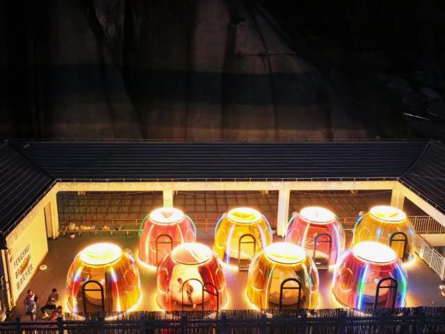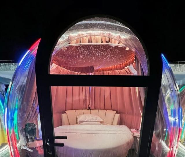 360°全景星空泡泡屋搭配多巴胺色的窗帘和唯美灯光,安全环保、坚固耐用的同时充满浪漫氛围,酒店级的入住体验温馨又舒适,纵情山野也不失精致。