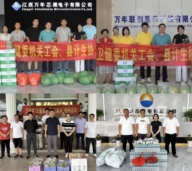 县卫健委、上坊乡、汪家乡等单位、乡镇负责人、工会主席分别来到万年芯、贡晶光电、联创显示等企业,润丰商圈、平安义警执勤点等处,开展“夏送清凉”活动。每到一处,他们都同职工亲切交谈,详细询问工作情况,叮嘱他们要注意防暑降温,关注身体健康,做好高温期间的各项安全措施,并为他们送上西瓜、绿豆、防暑药品等防暑降温物资等。
