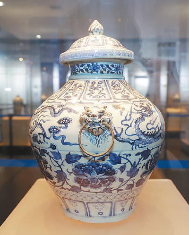 ▲图为高安元青花博物馆镇馆之宝青花云龙纹兽耳衔环盖罐。摄影丨吴文兵