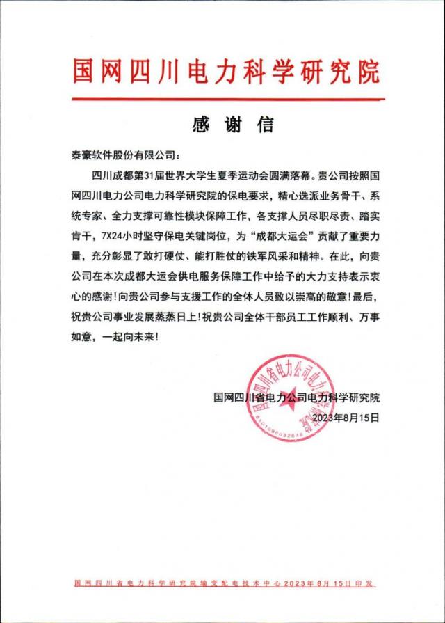 泰豪软件作为一家拥有多项重大活动保电服务经验的能源互联网公司,先后参与了“党的二十大”“北京冬奥会”等多项党和国家重大活动保电任务。此次成都大运会,泰豪软件作为支撑保障单位之一,牢记使命担当,积极肩负责任,赛事期间24小时值守一线,保障了本次赛事的顺利举办,展现了公司的责任担当,并收到了客户单位的感谢信。