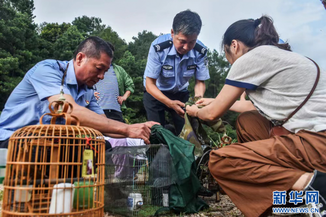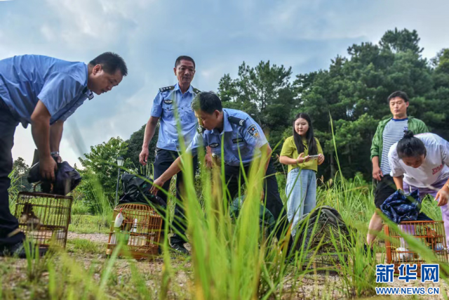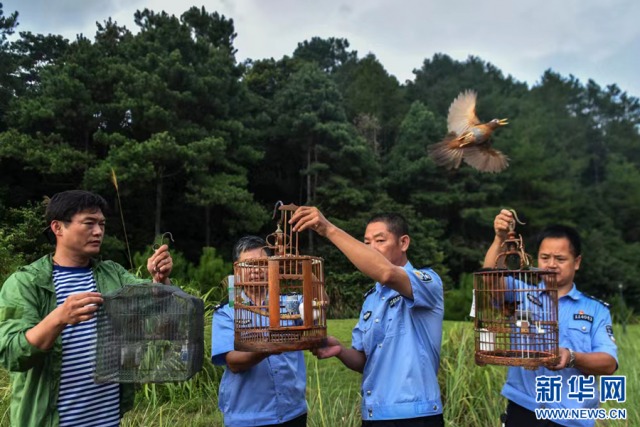 ▲近日,江西省抚州市资溪县公安局森林警察与野保执法人员将5只画眉鸟带至九龙湖国家级湿地公园放飞。新华网发吴志贵摄