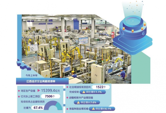 今年以来,江西省深入抓好稳经济一揽子政策措施落地见效,全省高质量发展稳步推进,呈现出工业生产稳步回升、发展新动能不断壮大、基础设施投资持续增长、消费进一步提质扩容等突出特点,上半年实现地区生产总值15399.4亿元,交出了一份殊为不易的“年中答卷”。