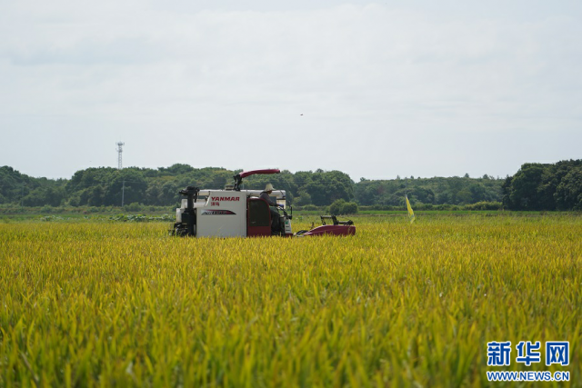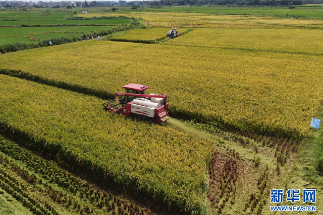 机插机收再生稻适合江西许多稻区推广,具有一种两收、省工省肥等特点。初秋时节,在江西省南昌市南昌县塘南镇民主村高标准农田示范区,收割机在成片的稻田中来回穿梭,吞进一行行稻穗后,吐出金黄的稻谷。