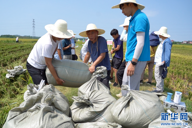 在江西省鄱阳县再生稻高产示范片,工作人员将收割的稻谷装袋。新华网王凯丰摄
