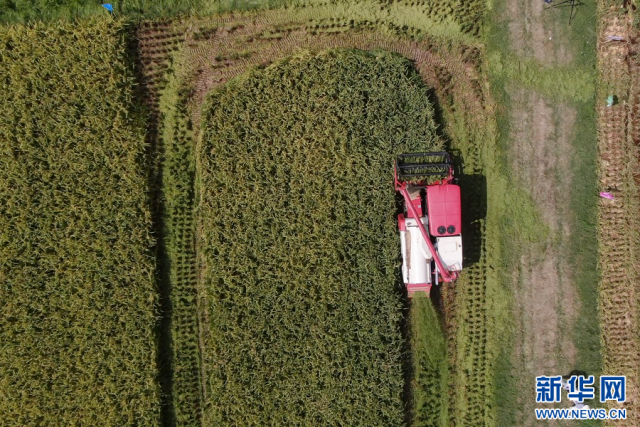 在江西省鄱阳县再生稻高产示范片,工作人员驾驶农机收割稻谷。新华网王凯丰摄