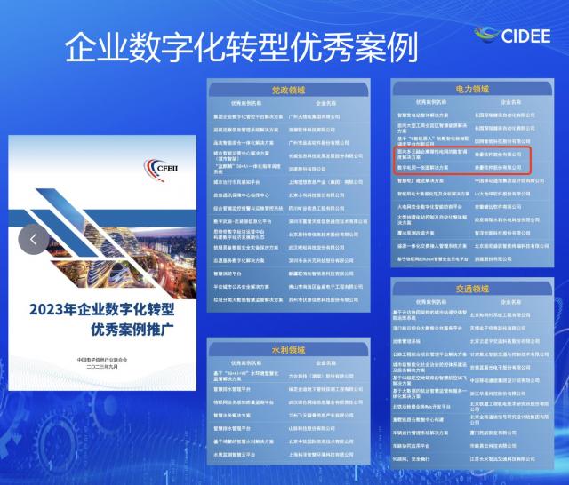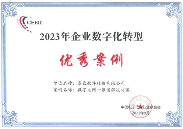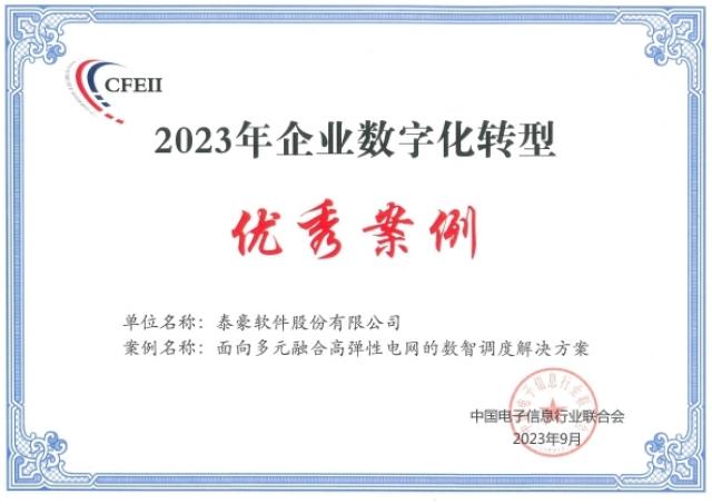 9月6日,中国电子信息行业联合会在河北石家庄2023年中国国际数字经济博览会上发布“2023年企业数字化转型优秀案例”,泰豪软件两项成果——“面向多元融合高弹性电网的数智调度解决方案”“数字电网一张图解决方案”入选电力领域企业数字化转型优秀案例,获得现场颁奖与表彰。
