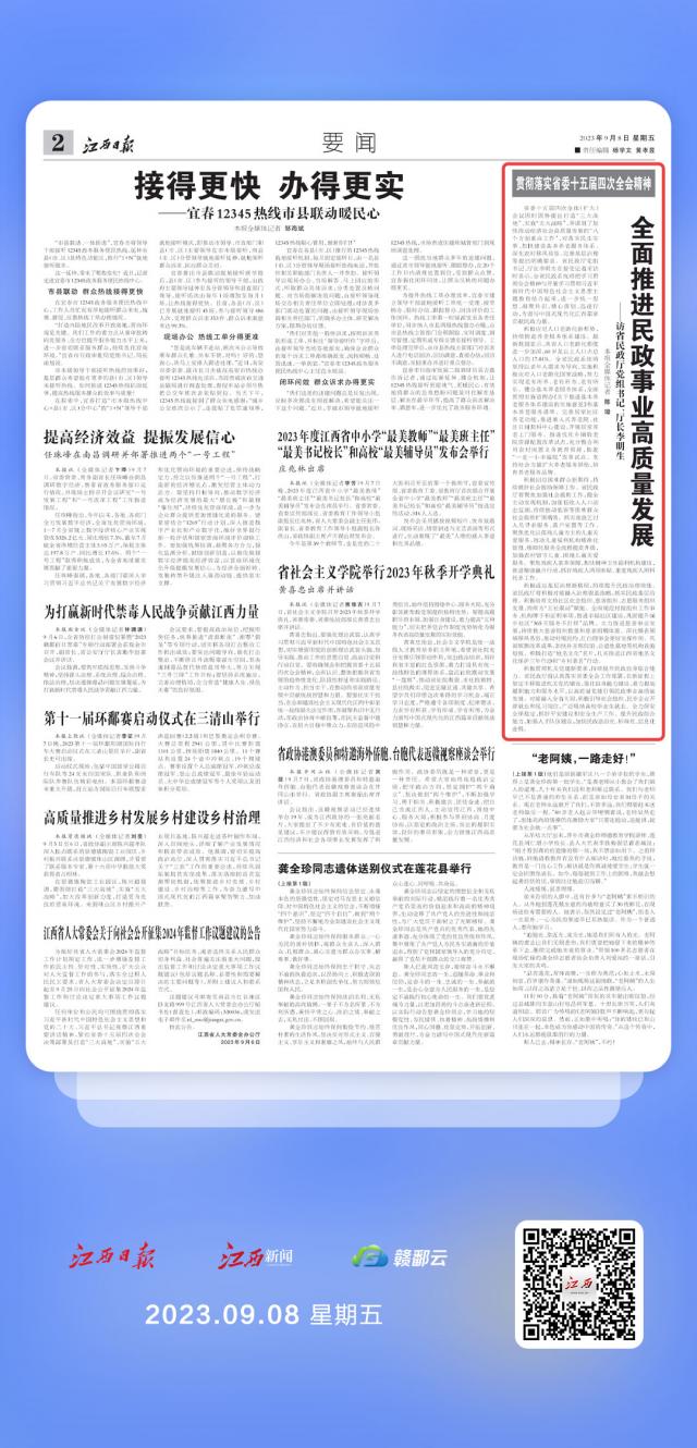 省委十五届四次全体(扩大)会议因时因势提出打造“三大高地”、实施“五大战略”,并谋划了加快推动经济社会高质量发展的“八个方面重点工作”,对落实民生实事、加快建设基本养老服务体系、深化农村移风易俗、完善基层治理等提出明确要求。省民政厅党组书记、厅长李明生在接受记者采访时表示,全省民政系统将把学习贯彻全会精神与开展学习贯彻习近平新时代中国特色社会主义思想主题教育结合起来,进一步统一思想、凝聚共识,精心谋划、迅速行动,为谱写中国式现代化江西篇章贡献民政力量。