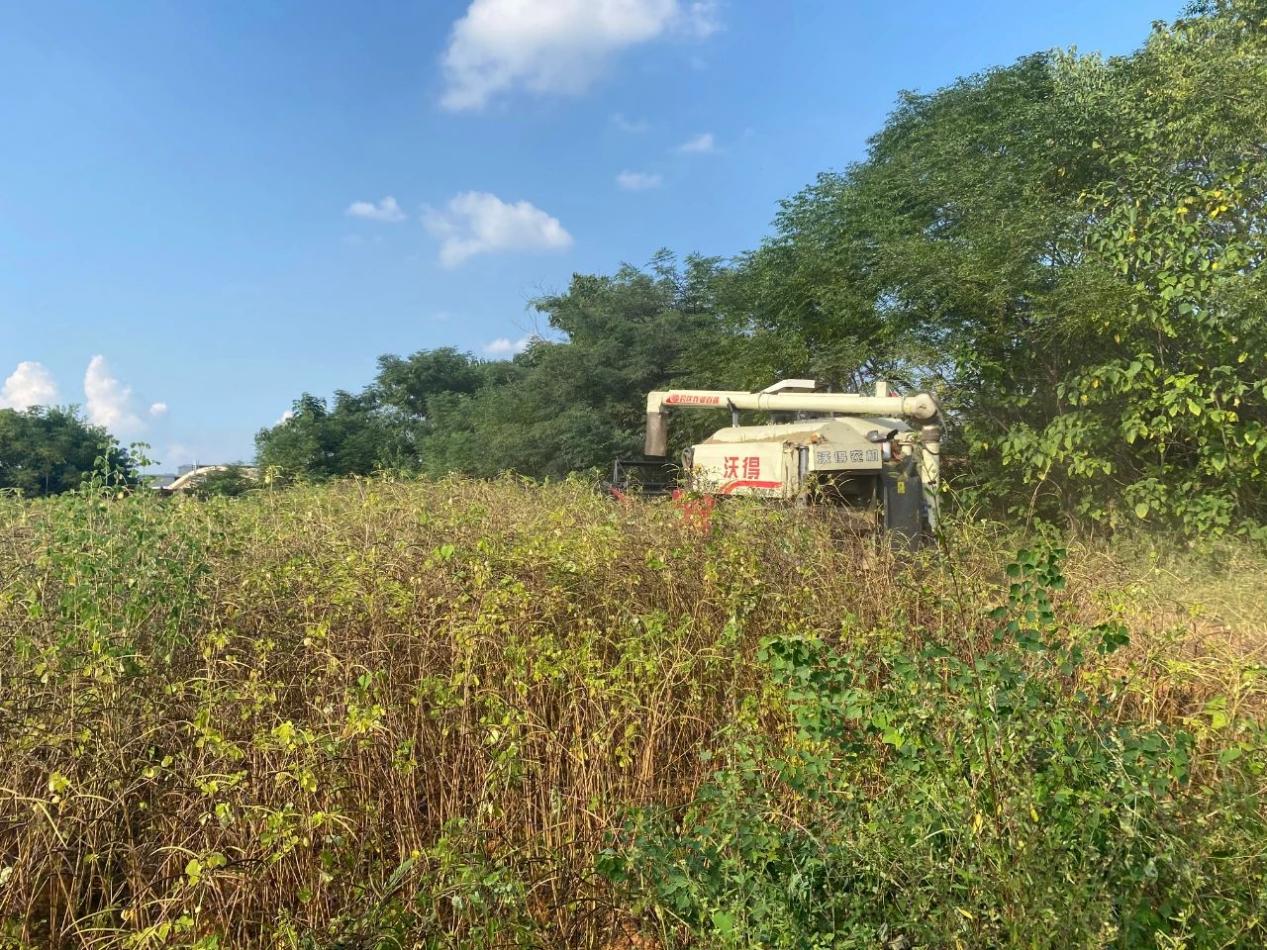 9月8日,在黄花堎村的山坡上,现代化的收割机在成熟的决明子种植地里穿梭,收割、脱粒、禾草粉碎……收割机的轰鸣声在山坡上回响。