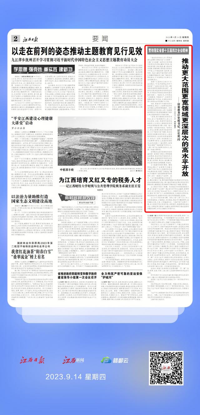 “省商务厅将深入学习贯彻省委全会精神,聚焦打造‘三大高地’、实施‘五大战略’,坚持以江西内陆开放型经济试验区建设为统领,坚持改革创新、对标先进,着力推动更大范围、更宽领域、更深层次的高水平开放,以开放促创新、促改革、促发展,为奋力谱写中国式现代化的江西篇章贡献商务力量。”省商务厅党组书记、厅长犹㼆近日在接受记者采访时表示。