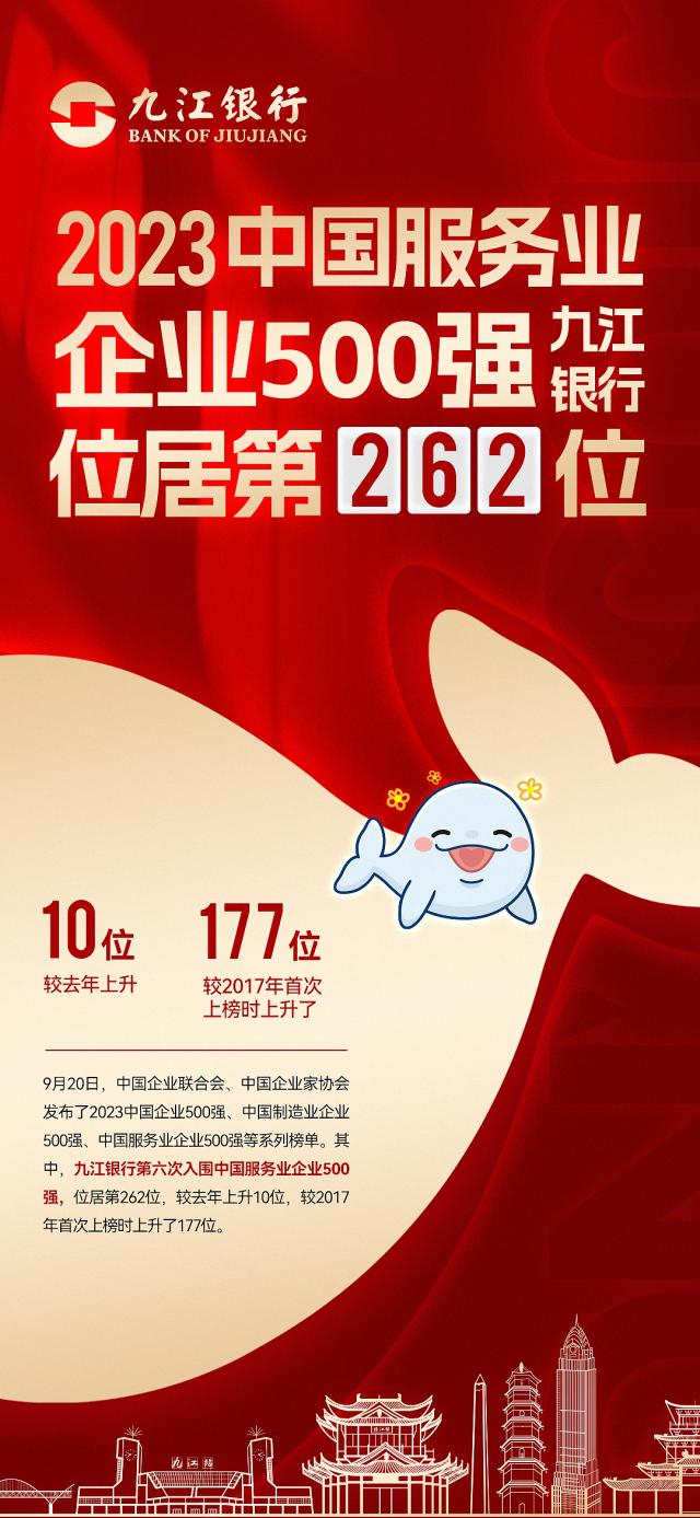 9月20日,中国企业联合会、中国企业家协会发布了2023中国企业500强、中国制造业企业500强、中国服务业企业500强等系列榜单。其中,九江银行第六次入围中国服务业企业500强,位居第262位,较去年上升10位,较2017年首次上榜时上升了177位。