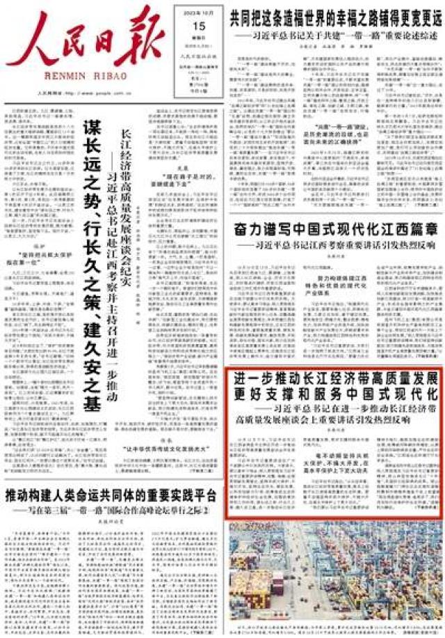 人民日报头版报道:习近平总书记在进一步推动长江经济带高质量发展座谈会上重要讲话引发热烈反响