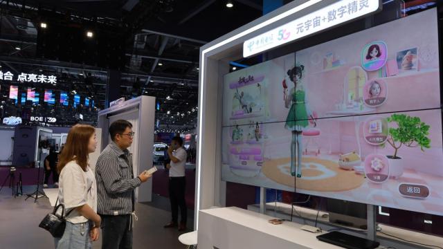 在中国电信展区,工作人员向观众介绍元宇宙+数字精灵情况。新华网 王晓震摄