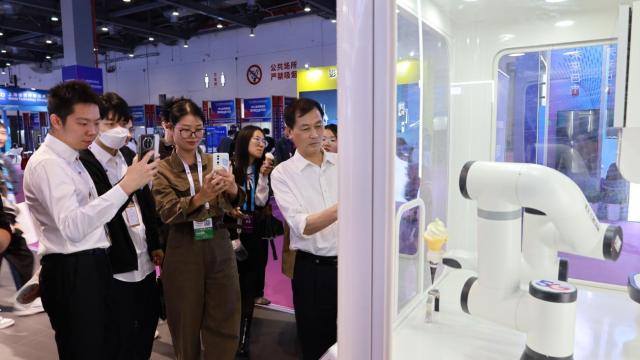 在中国电信展区,众多观众打卡体验机器人制作冰淇淋。新华网王晓震摄