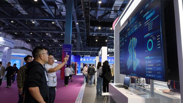 在中国电信展区,工作人员向观众介绍元宇宙+数字政府情况。新华网 王晓震摄