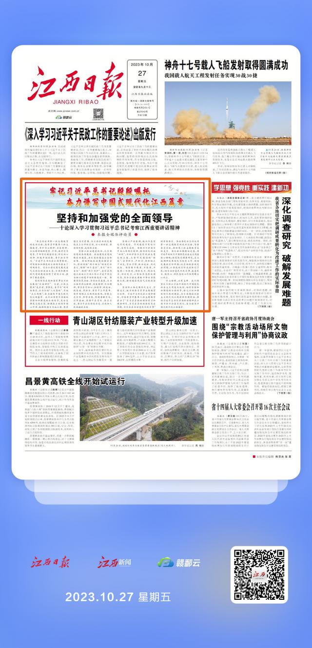 党的领导是党和国家事业不断发展的“定海神针”。当前,江西正聚焦“走在前、勇争先、善作为”的目标要求,全力打造“三大高地”、实施“五大战略”,奋力谱写中国式现代化江西篇章。我们必须毫不动摇地坚持和加强党的全面领导,充分发挥党总揽全局、协调各方的领导核心作用,把路线图变为施工图、愿景图变为实景图,为江西在新的发展起点上打开新空间、注入新动能、塑造新优势、成就新业绩。