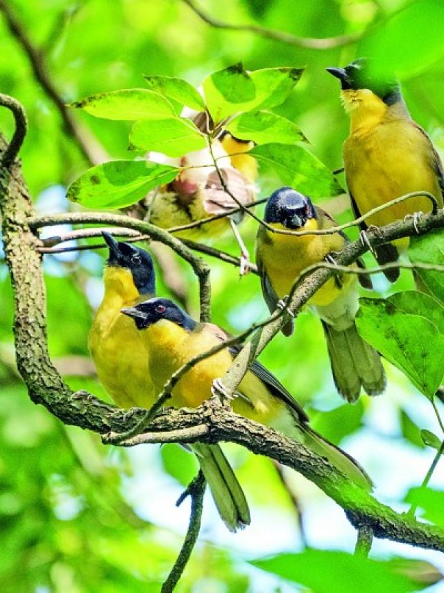 突然,阵阵欢快悦耳的鸟鸣打破了周遭静谧。记者循声举起长焦镜头,透过枫杨树冠缝隙,只见十几只国家一级保护动物蓝冠噪鹛正在枝头“排排坐”——顶冠呈蓝灰色,戴着黑色“面罩”,身披褐色羽衣,内里搭一件鲜黄“衬衫”。它们时而嬉戏鸣唱,时而互相梳理羽毛,好不热闹!