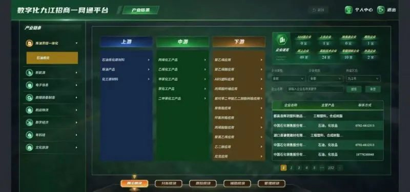平台分为展示模块、分析模块、跟踪模块、辅助模块与管理模块五大功能模块,配套微信小程序,搭载AI问答助手,实现大中小三屏联动,实现招商信息高效流转、招商成果共享、产业共融共赢,提高整体招商工作效能。平台聚焦九江市石化化工、电子信息、新能源等九大制造业产业链,整合了九江经济数据、土地载体数据、重点产业链数据与全国工商企业数据,聚焦地方九大主导制造业产业链,通过对500强企业、上市公司、独角兽企业、隐形冠军等全国重点企业数据进行数据治理与动态更新,打造产业链精准招商地图,成为领导决策层的指挥调度平台、招商人员的协同工作平台、投资客商的惠企助投平台,切实提升全市招商引资工作效率和服务水平。