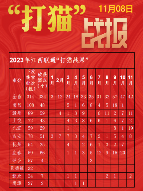 2023年,江西联通累计向公安机关推送异常开卡、GOIP线索226批次,协助捣毁窝点330个,抓获嫌疑人332名,缴获设备415台、号卡232张,与此同时针对日益猖獗的“土炮GOIP”,江西联通打猫团队亦突破传统的信令维度,结合互联网流量分析,建立大数据反诈监测系统,制定了高风险卡清理机制,累计清理高危风险卡26万户。