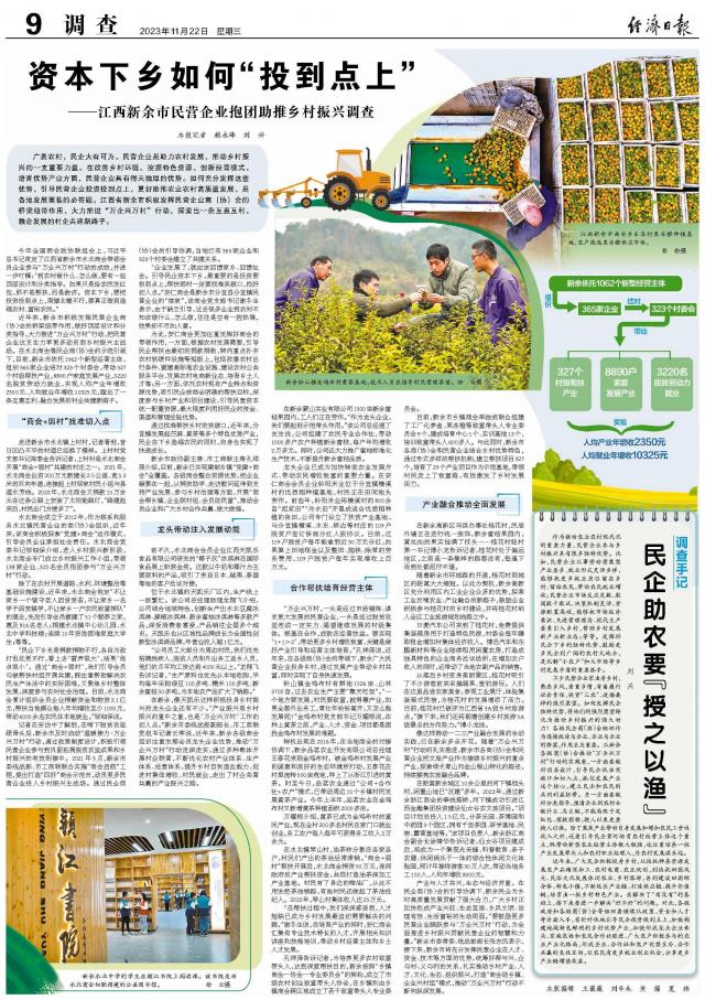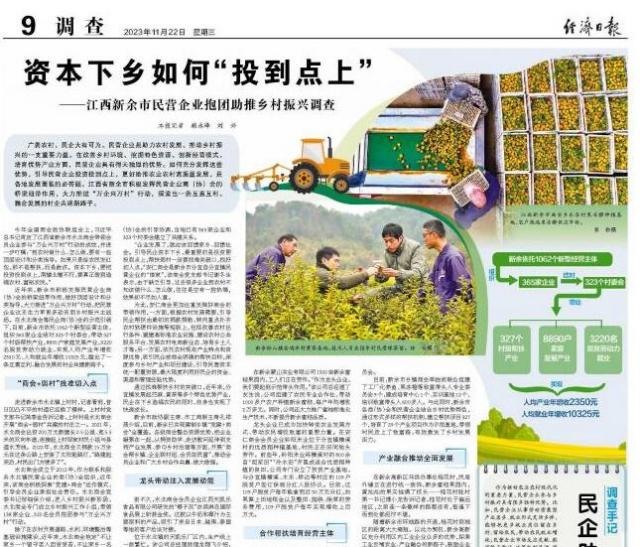广袤农村,民企大有可为。民营企业是助力农村发展、推动乡村振兴的一支重要力量。在改善乡村环境、挖掘特色资源、创新经营模式、培育优势产业方面,民营企业具有得天独厚的优势。如何充分发挥这些优势,引导民营企业投资投到点上,更好助推农业农村高质量发展,是各地发展面临的必答题。江西省新余市积极发挥民营企业商(协)会的桥梁纽带作用,大力推进“万企兴万村”行动,探索出一条互惠互利、融合发展的村企共建新路子。