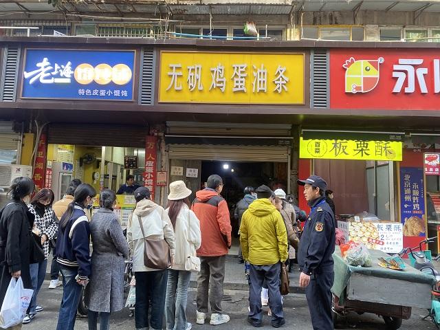 时间:2023年12月5日早晨,地点:南昌市东湖区大士院的半步街“老南昌白糖糕”小吃店门前,一名城管队员正在店门前整理规范电动共享单车,另有穿着“南昌环卫”工服的保洁人员在附近清洁卫生,而长长的队伍井然有序地排队购买食物。