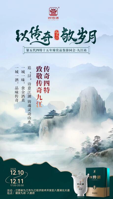 12月10日-11日,四特酒高端私享品鉴会——“以传奇·敬岁月”第五代四特十五年臻赏品鉴游园会于浔城九江开启,之后将进入宜春、上饶、南昌等地。